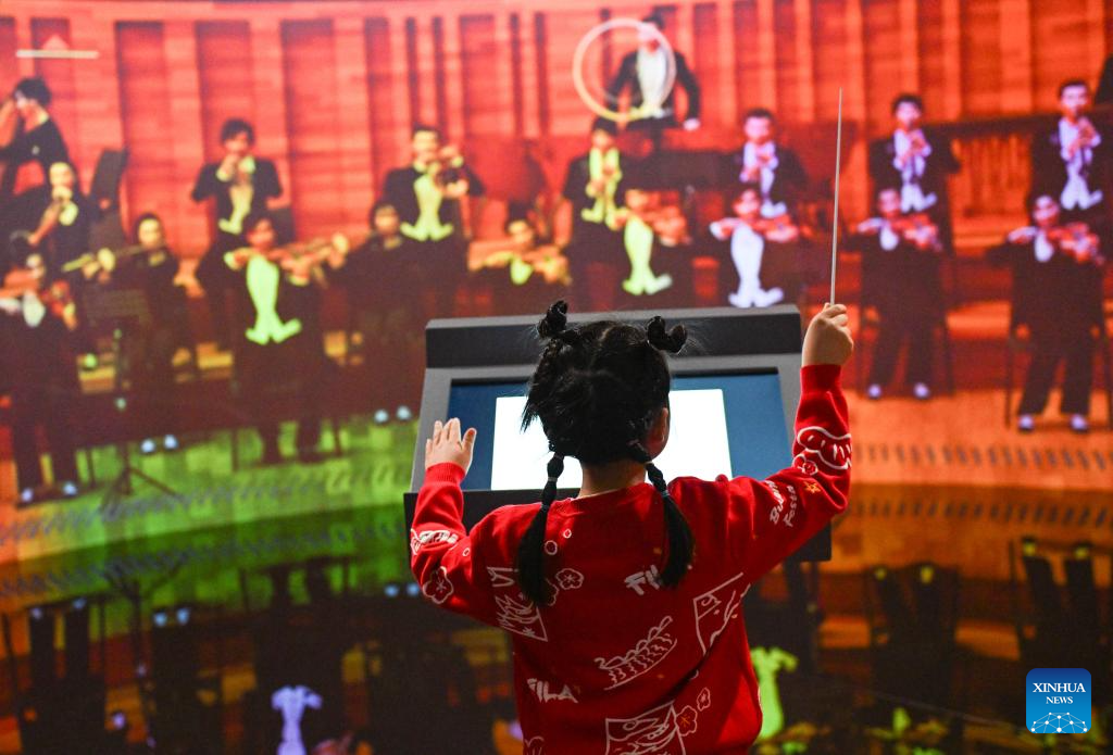 A child experiences interactive video device at a digital art show of the National Centre for the Performing Arts (NCPA) in Beijing, capital of China, Dec. 22, 2024. NCPA staged 15 performances and more than 50 activities on its open day to celebrate its 17th anniversary. (Xinhua/Chen Zhonghao)