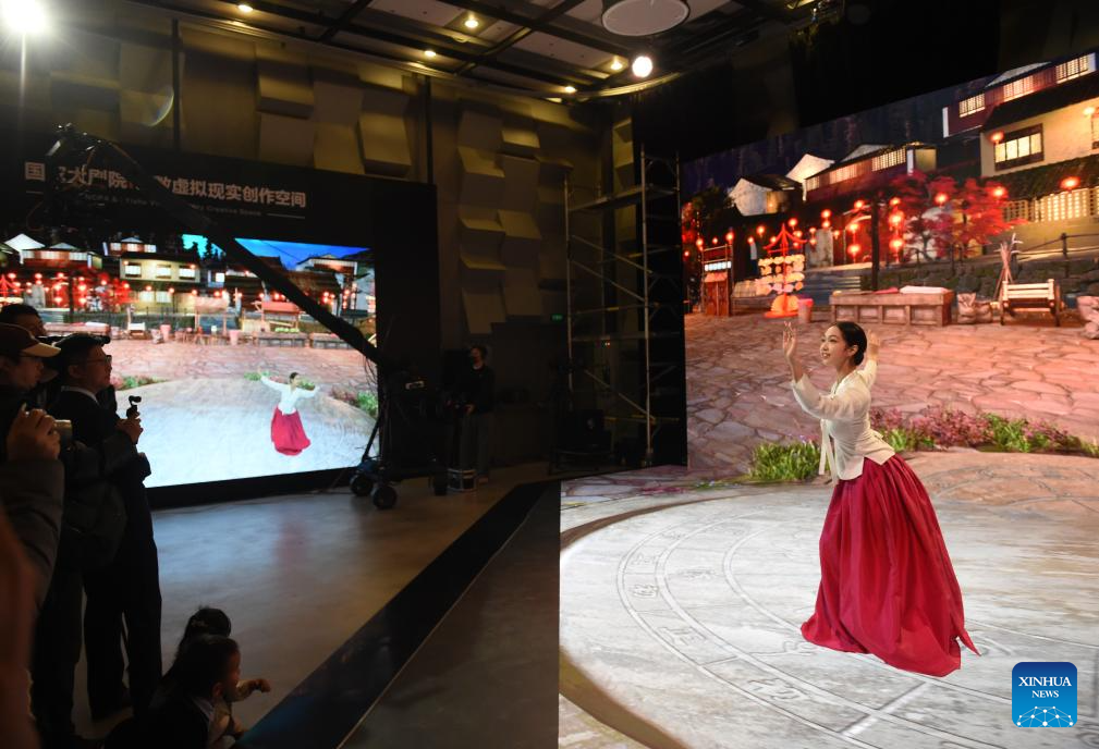 People visit the extended reality (XR) creation space at the National Centre for the Performing Arts (NCPA) in Beijing, capital of China, Dec. 22, 2024. NCPA staged 15 performances and more than 50 activities on its open day to celebrate its 17th anniversary. (Xinhua/Luo Xiaoguang)