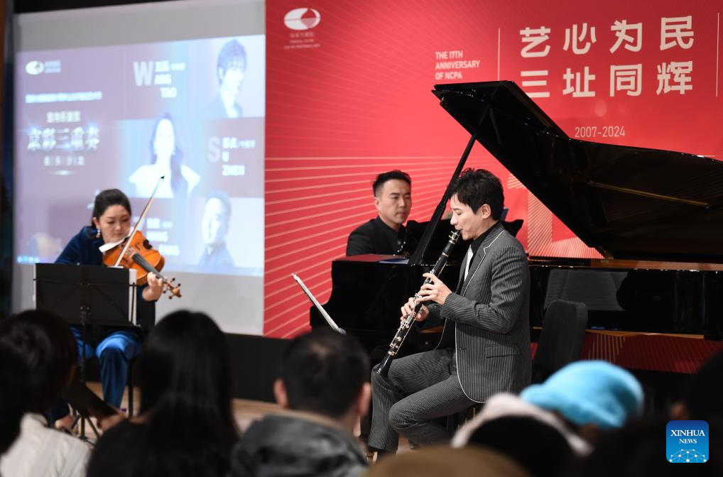 Artists perform at the press conference hall of the National Centre for the Performing Arts (NCPA) in Beijing, capital of China, Dec. 22, 2024. NCPA staged 15 performances and more than 50 activities on its open day to celebrate its 17th anniversary. (Xinhua/Luo Xiaoguang)