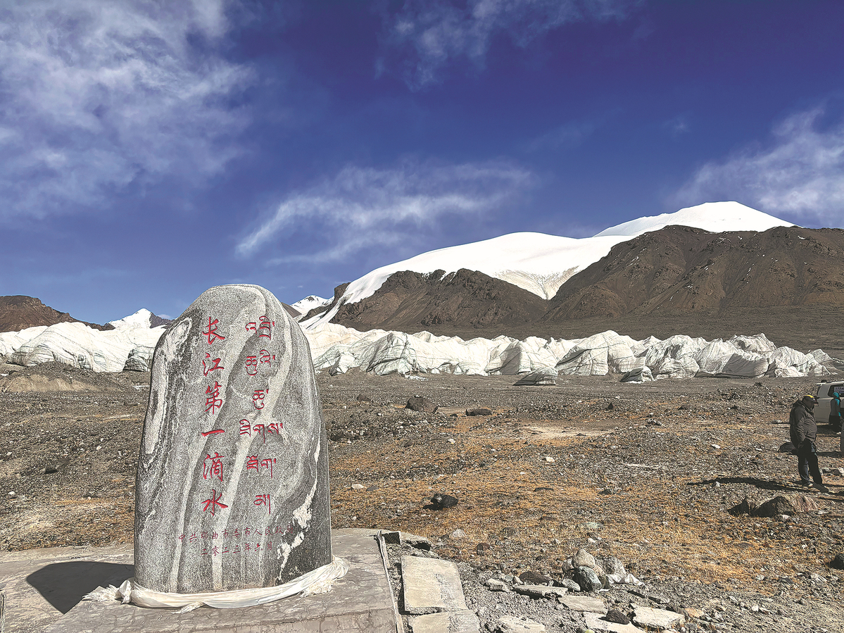 A stele that says "Yangtze River's first drop of water" sits near the Jangchu Diruk Glacier in Amdo county of Nagchu, Xizang autonomous region. (Palden Nyima/China Daily)
