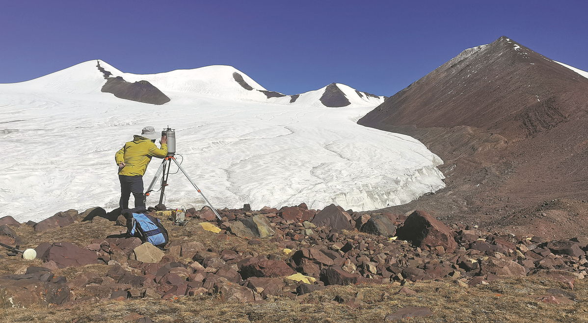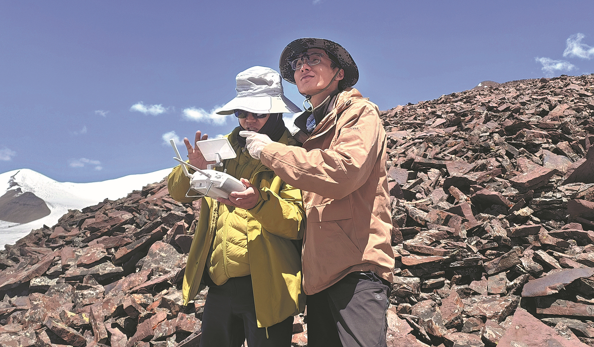 Xu Qiangqiang, an assistant researcher at the China Academy of Sciences' Northwest Institute of Eco-Environment and Resources, measures the size of the Dongkemadi Glacier using a laser radar in Nagchu, Xizang autonomous region, in October. (Palden Nyima/China Daily)