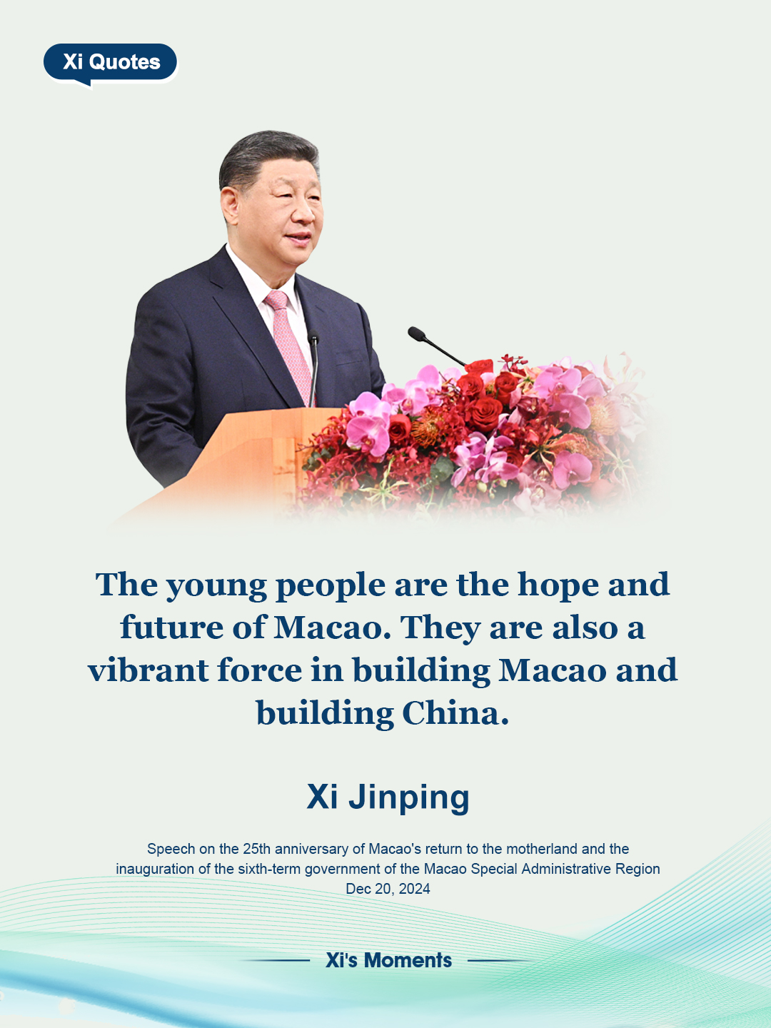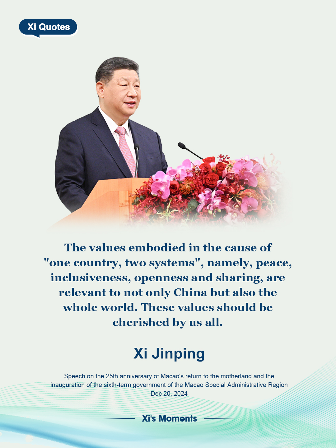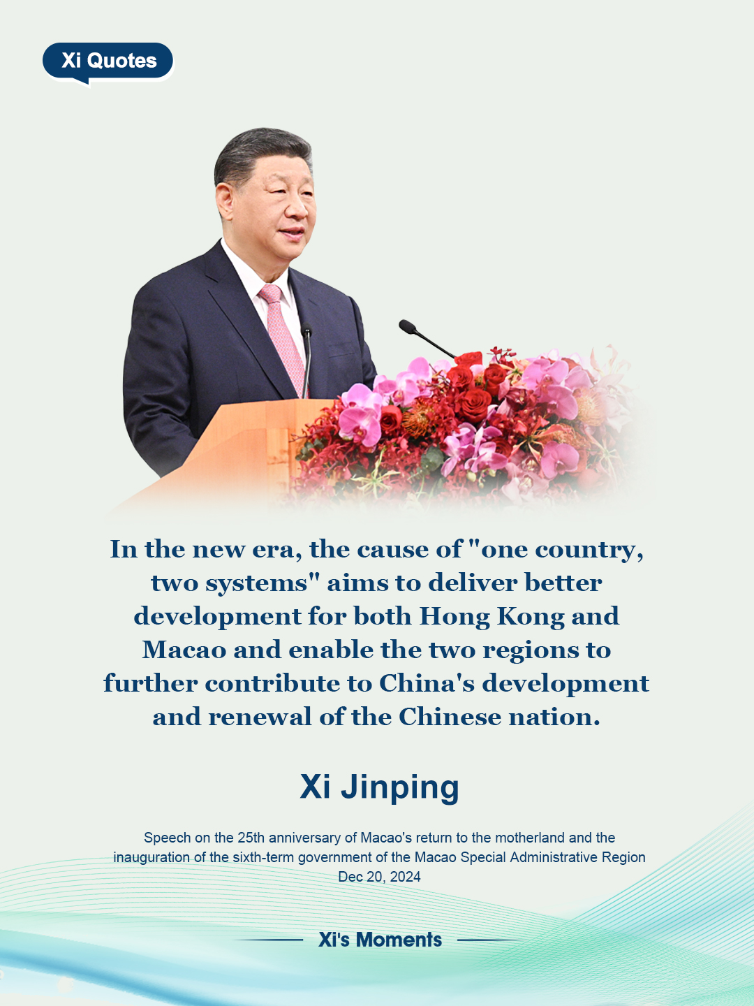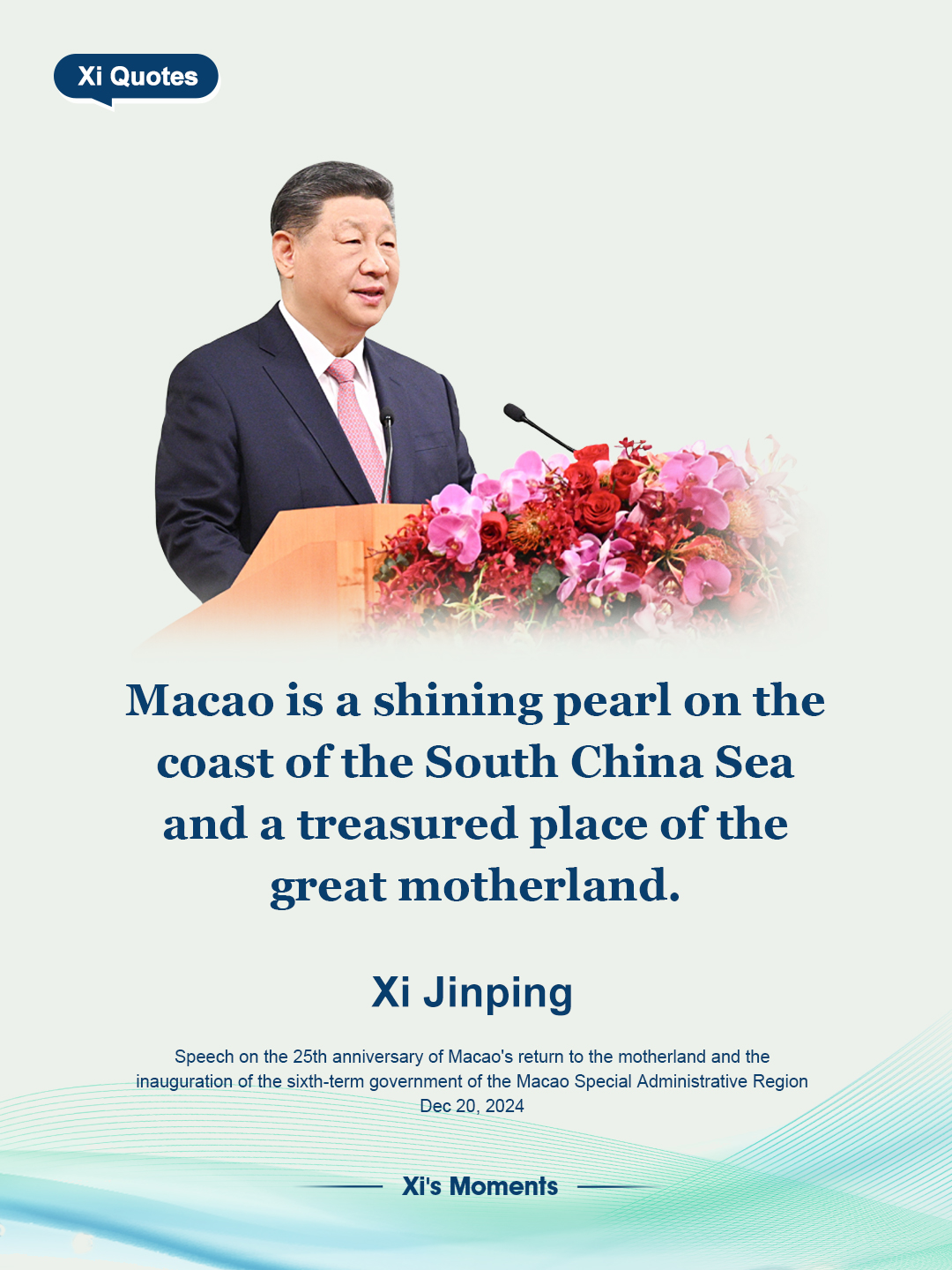 President Xi Jinping delivered a speech at a meeting on Friday celebrating the 25th anniversary of Macao's return to the motherland and the inaugural ceremony of the sixth-term government of the Macao Special Administrative Region. Here are some highlights.
