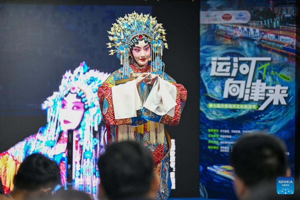 An actress performs traditional opera for passengers aboard a sightseeing boat on Haihe River in Tianjin, north China, March 28, 2024. Dec. 23 this year marks the 620th anniversary of establishment of the Tianjin City, which now stands as a tremendous attraction for tourists from home and abroad. (Xinhua/Sun Fanyue)