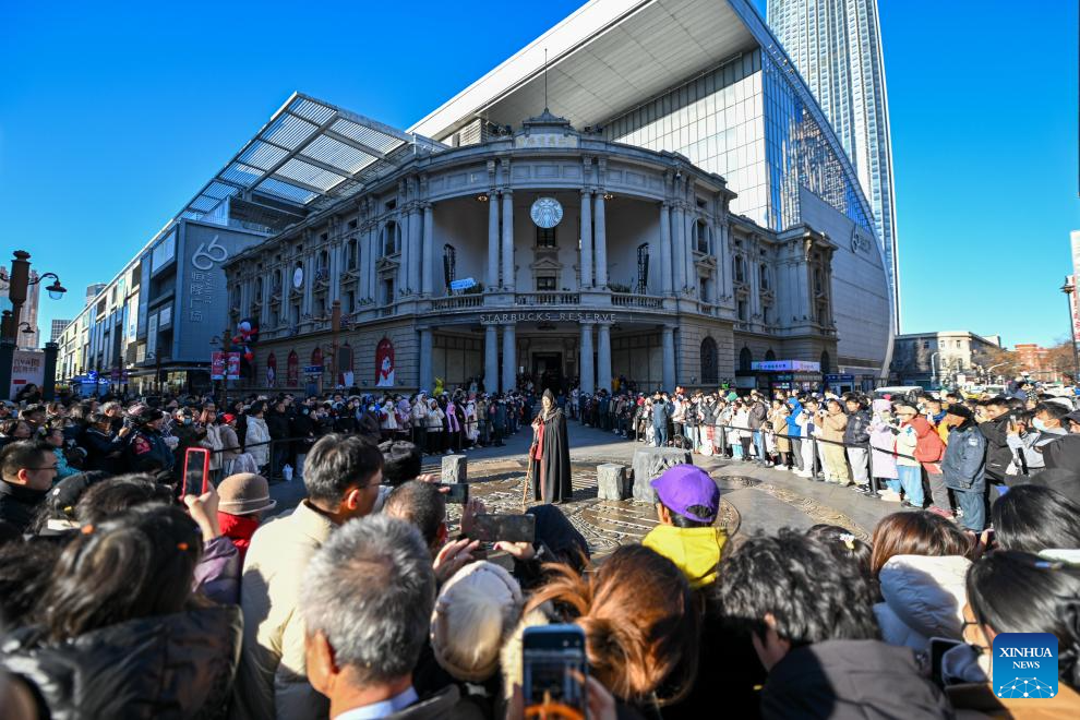 People watch an opera performance on the Golden Street in Tianjin, north China, Dec. 21, 2024. Dec. 23 this year marks the 620th anniversary of establishment of the Tianjin City, which now stands as a tremendous attraction for tourists from home and abroad. (Xinhua/Sun Fanyue)