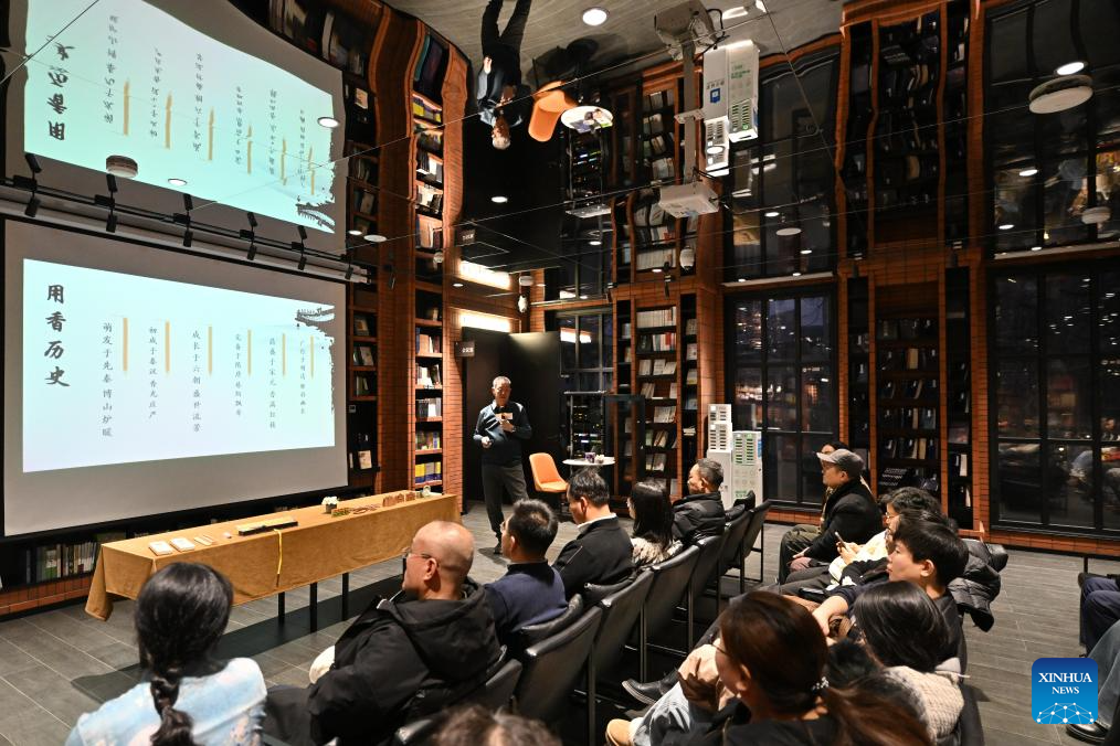 Readers attend in a night reading party at the Zhongshuge Bookstore in the Italian Style Area in Tianjin, north China, Dec. 19, 2024. Dec. 23 this year marks the 620th anniversary of establishment of the Tianjin City, which now stands as a tremendous attraction for tourists from home and abroad. (Xinhua/Sun Fanyue)