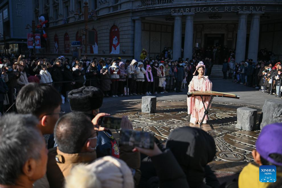 An actor plays the guzheng, a traditional Chinese musical instrument, at the Golden Street commercial area in north China's Tianjin, Dec. 21, 2024. Dec. 23 this year marks the 620th anniversary of establishment of the Tianjin City, which now stands as a tremendous attraction for tourists from home and abroad. (Xinhua/Sun Fanyue)