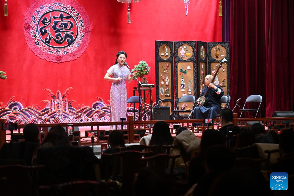 An actor performs a story-telling vocal at a theater of Deyunshe, the crosstalk troupe led by Guo Degang, in Tianjin, north China, Dec. 21, 2024. Dec. 23 this year marks the 620th anniversary of establishment of the Tianjin City, which now stands as a tremendous attraction for tourists from home and abroad. (Xinhua/Sun Fanyue)