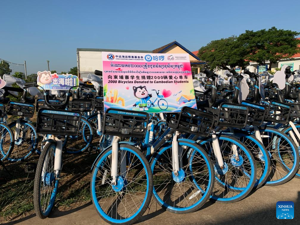 The bikes were donated by bike-sharing service provider Hello Inc. and shipped to Cambodia by the COSCO Shipping Charity Foundation.