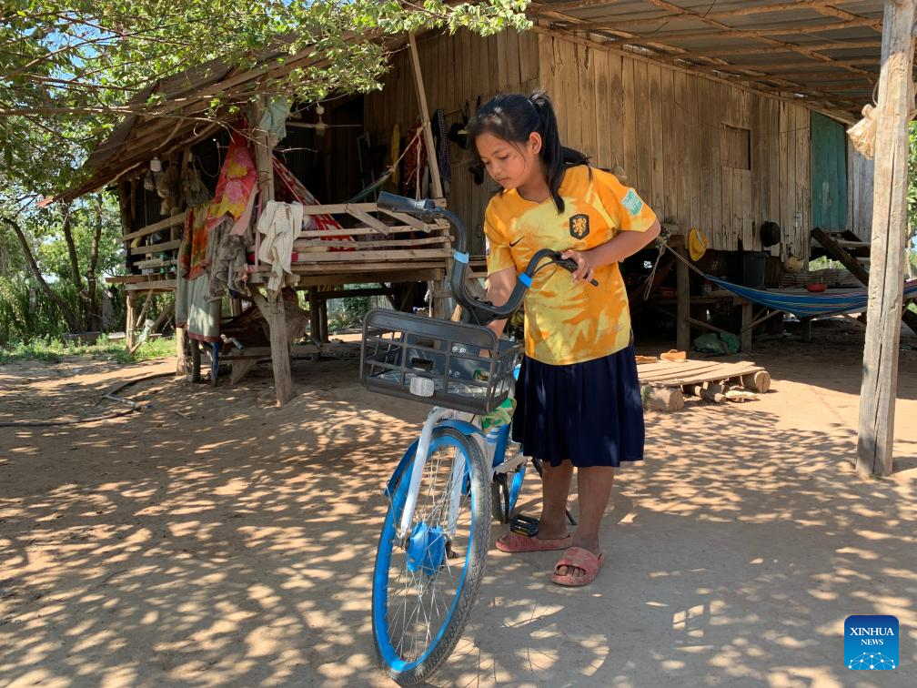 A primary school student cleans her bike donated by Chinese Hello Inc. in Kampong Thom province, Cambodia on Dec. 23, 2024. Chinese charities on Monday donated 2,000 bicycles and 12,000 school bags from the Panda Pack project to primary schools in Cambodia. A ceremony under the theme "Hearts Connect along the Silk Road" was held at the Balaing Khang Lech Primary School in central Kampong Thom province's Stung Sen town. The bikes were donated by bike-sharing service provider Hello Inc. and shipped to Cambodia by the COSCO Shipping Charity Foundation. (Photo by Van Pov/Xinhua)