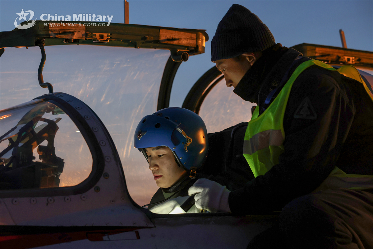 A cadet pilot assigned to a regiment of the Chinese PLA Naval Aviation University makes preparations for the flight with the help of a maintenance man before a flight training exercise in late November, 2024. (eng.chinamil.com.cn/Photo by Lan Pengfei)