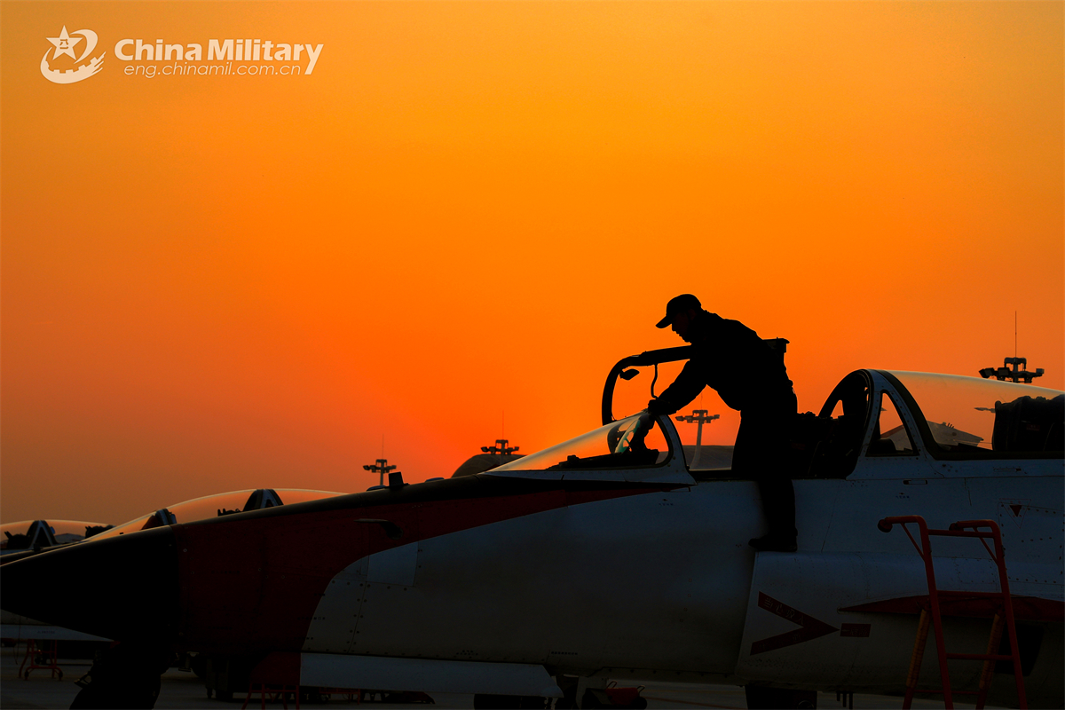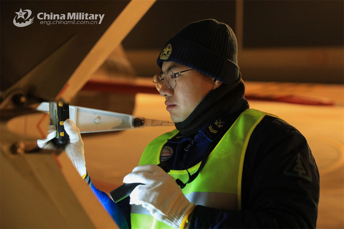 A maintenance man assigned to a regiment of the Chinese PLA Naval Aviation University conducts pre-flight inspections on a jet trainer during a flight training exercise in late November, 2024. (eng.chinamil.com.cn/Photo by Lan Pengfei)