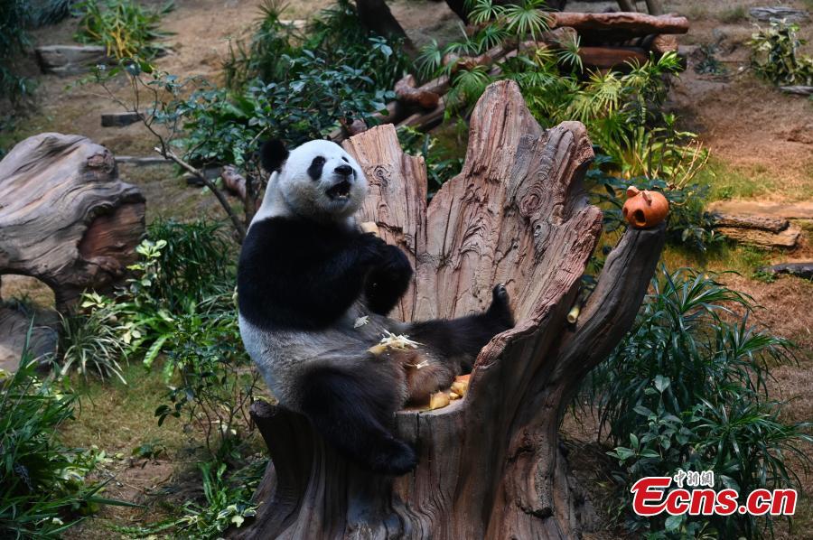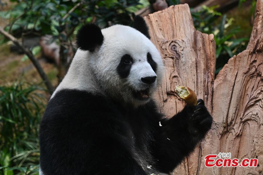 Giant Panda Ke Ke enjoys bamboo shoots at Ocean Park in the Hong Kong Special Administrative Region, Dec. 23, 2024. (China News Service/Li Zhihua)