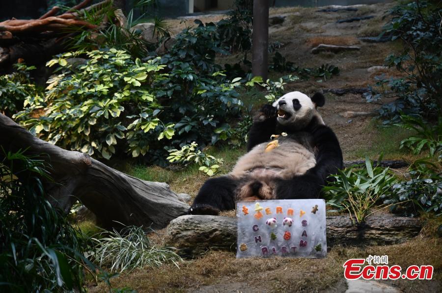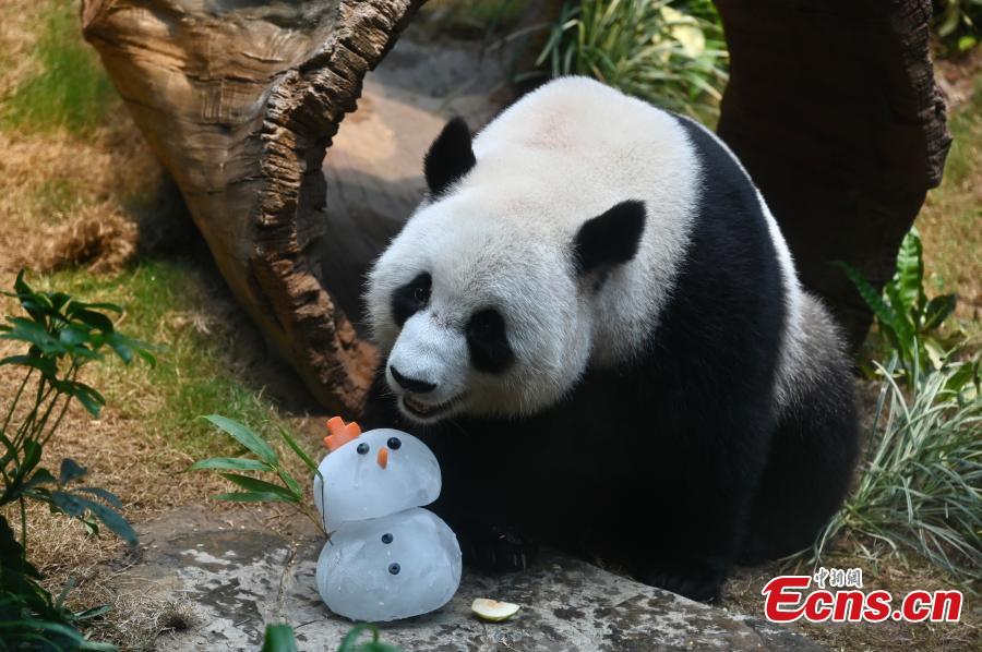 Giant Panda Ke Ke is presented with an ice snowman at Ocean Park in the Hong Kong Special Administrative Region, Dec. 23, 2024. (China News Service/Li Zhihua)