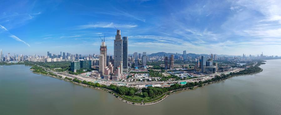 An aerial panoramic drone photo taken on Oct. 3, 2024 shows a view of the Shenzhen bay aera under construction in Shenzhen, south China's Guangdong Province. (Xinhua/Liang Xu)