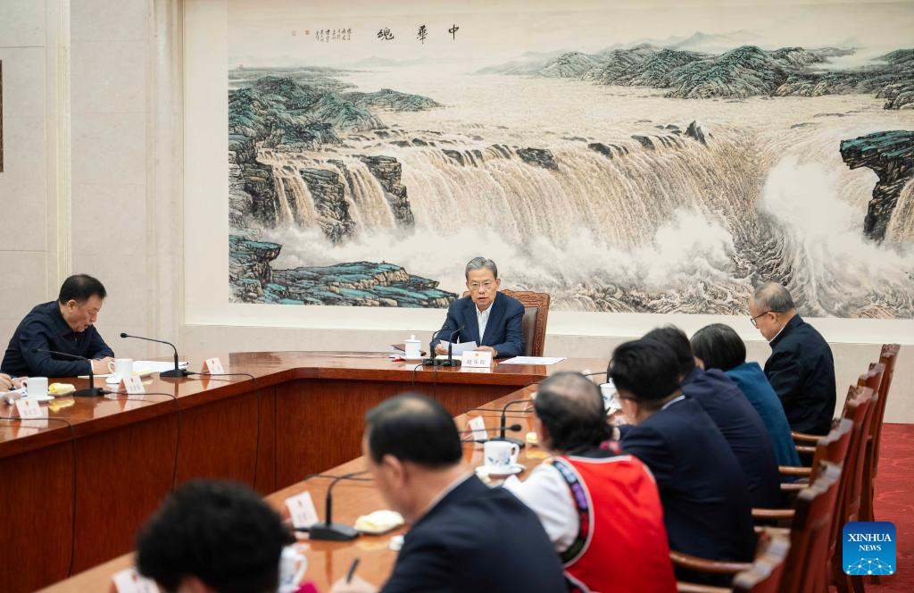 Zhao Leji, a member of the Standing Committee of the Political Bureau of the Communist Party of China Central Committee and chairman of the National People's Congress (NPC) Standing Committee, attends a lawmakers' symposium held on the sidelines of a legislative session on Dec. 24, 2024. (Xinhua/Li Tao)