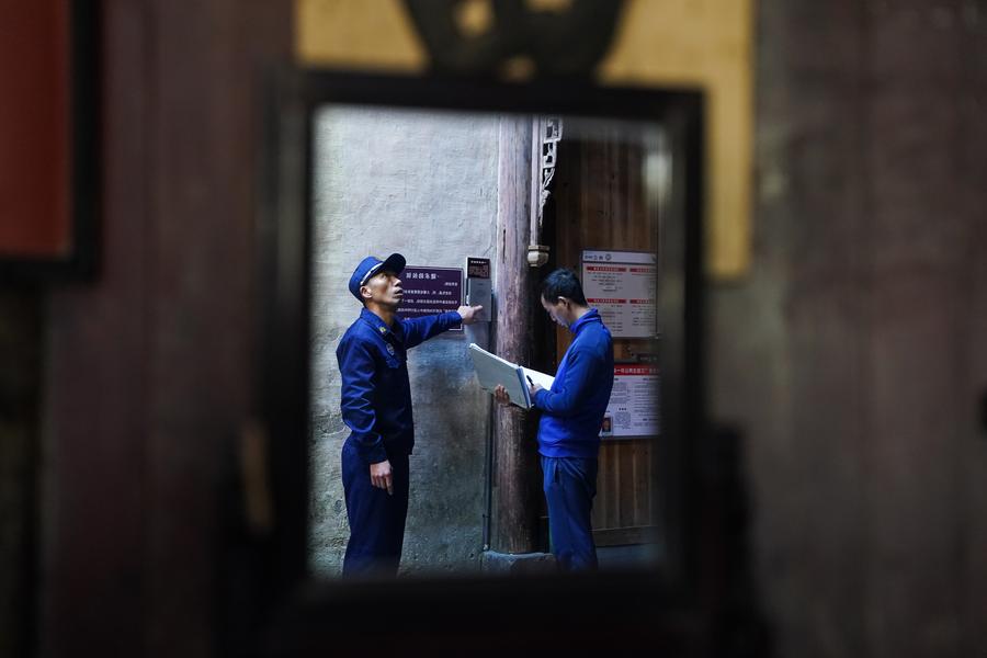 Fire captain Shu Jianjun (L) and his colleague Xie Xiaoqiang check fire alarm equipment in an ancient residential house in Hongcun Village of Yixian County in Huangshan City, east China's Anhui Province, Dec. 19, 2024. (Xinhua/Du Yu)