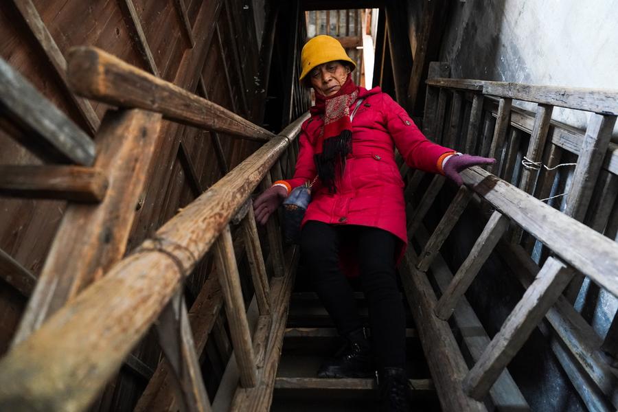 Ancestral hall conservator Hu Xiaowen inspects an ancient building in Xidi Village of Yixian County in Huangshan City, east China's Anhui Province, Dec. 18, 2024. (Xinhua/Du Yu)