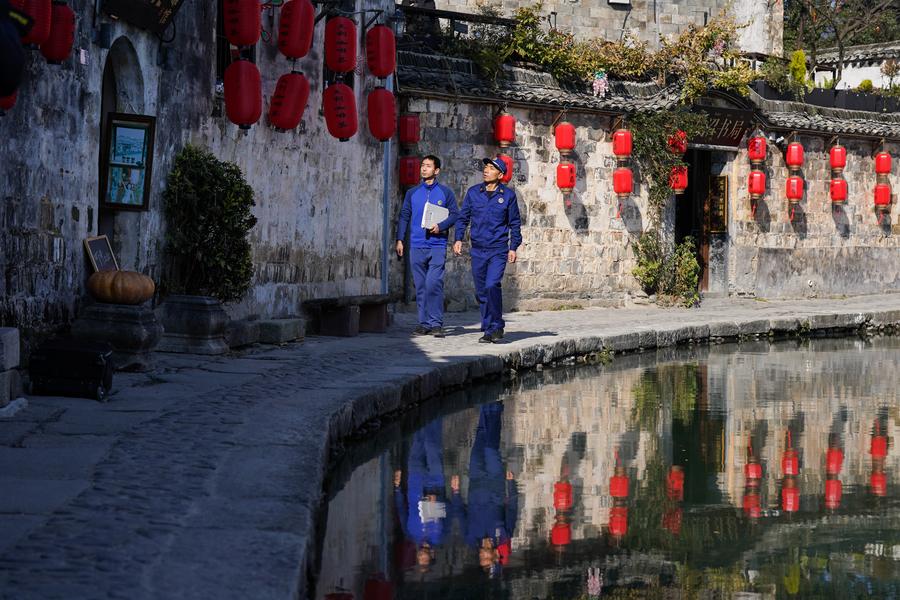 Fire captain Shu Jianjun (R) patrols with his colleague Xie Xiaoqiang in Hongcun Village of Yixian County in Huangshan City, east China's Anhui Province, Dec. 19, 2024. (Xinhua/Du Yu)