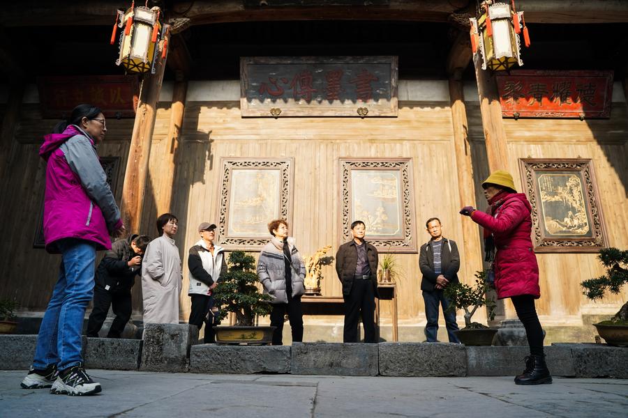 Ancestral hall conservator Hu Xiaowen (1st R) explains to visitors at an ancient building in Xidi Village of Yixian County in Huangshan City, east China's Anhui Province, Dec. 18, 2024. (Xinhua/Du Yu)