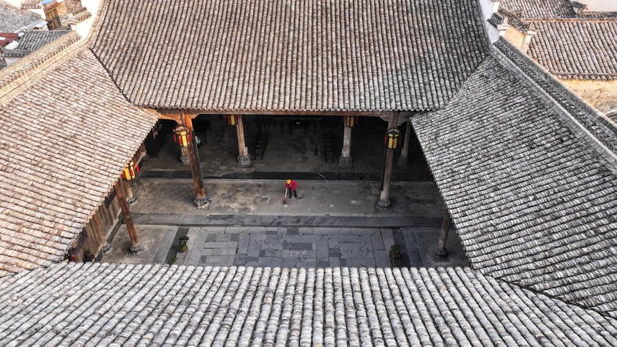 This aerial drone photo taken on Dec. 18, 2024 shows ancestral hall conservator Hu Xiaowen cleaning at a yard of an ancestral hall in Xidi Village of Yixian County in Huangshan City, east China's Anhui Province. (Xinhua/Du Yu)