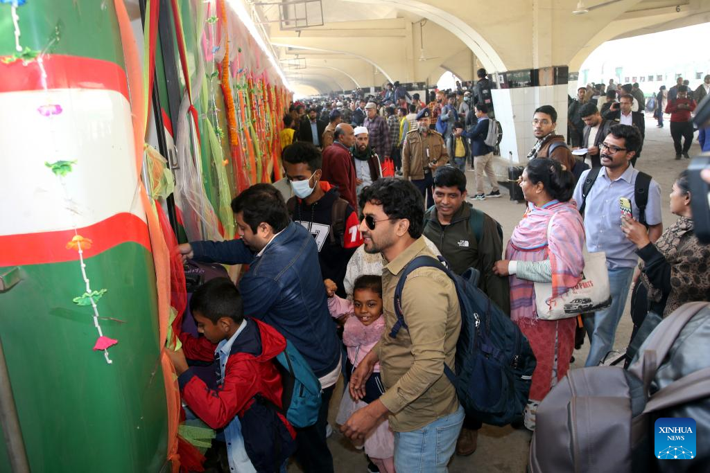 People taking the first train of the Padma Bridge Rail Link Project (PBRLP) arrive at Dhaka station, Dhaka, Bangladesh, Dec. 24, 2024. (Xinhua)