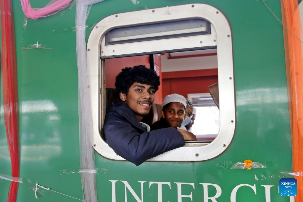 People are pictured inside a train of the Padma Bridge Rail Link Project (PBRLP) at Dhaka station, Dhaka, Bangladesh, Dec. 24, 2024. (Xinhua)