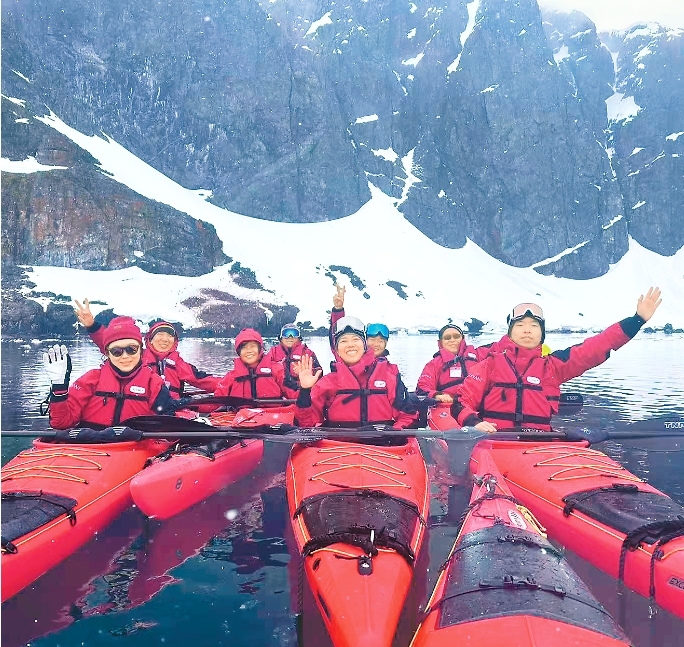 Chinese tourists pose for a picture in the Antarctic. (Photo provided by UTour Group)