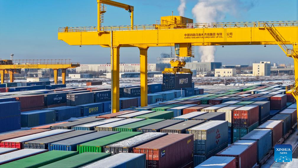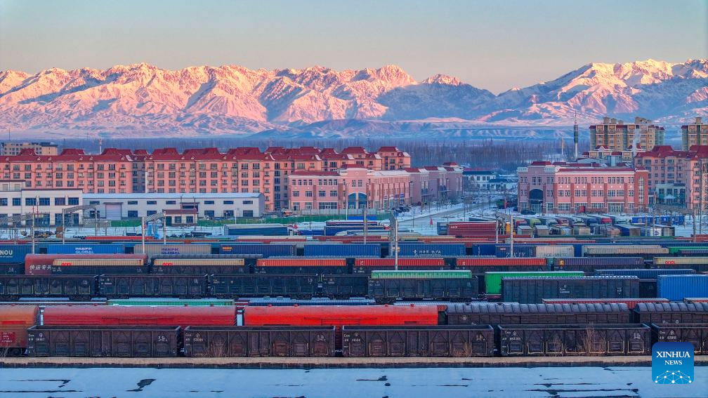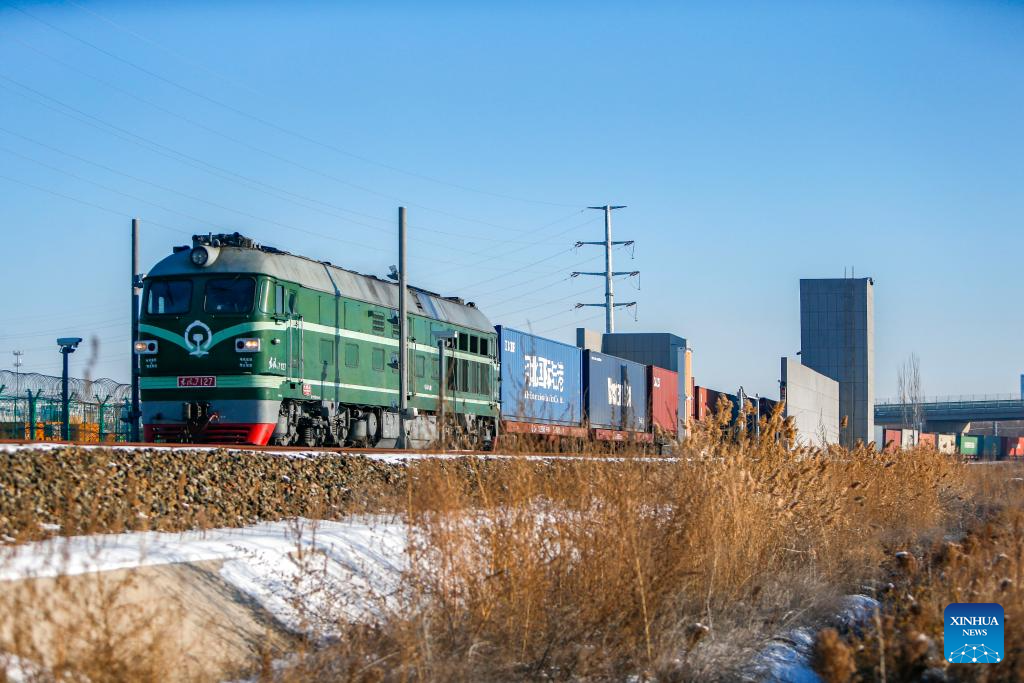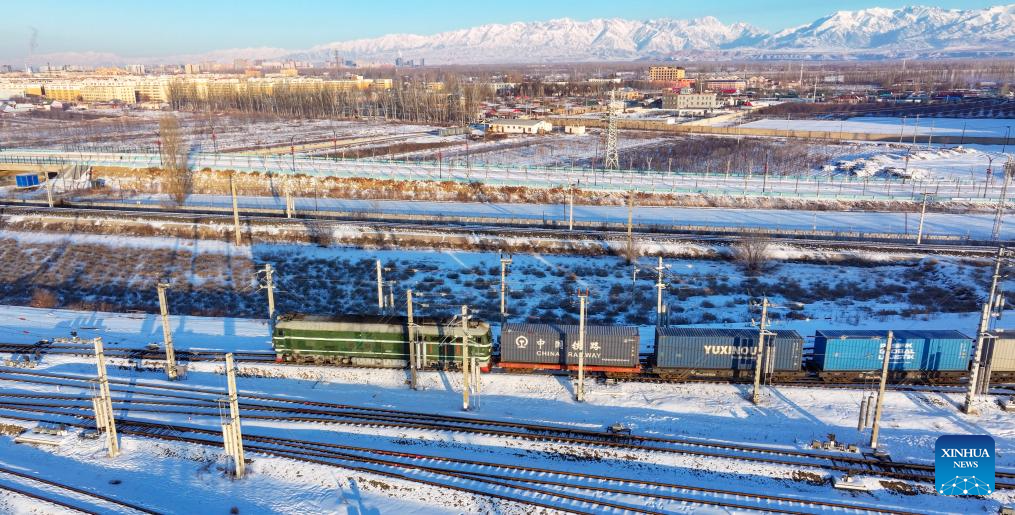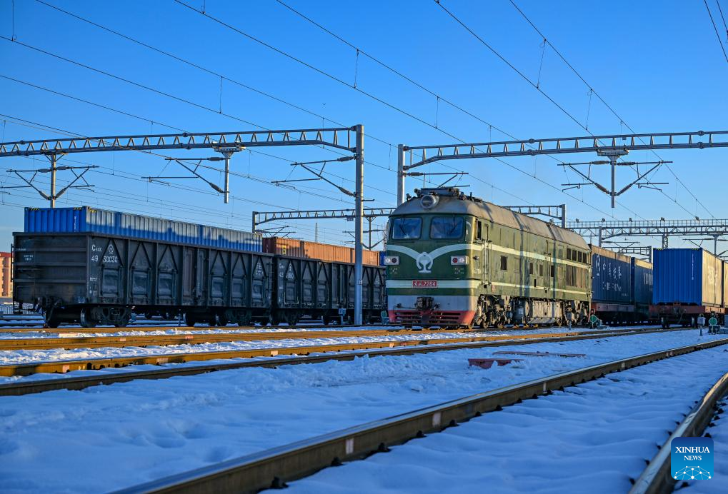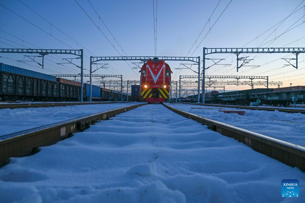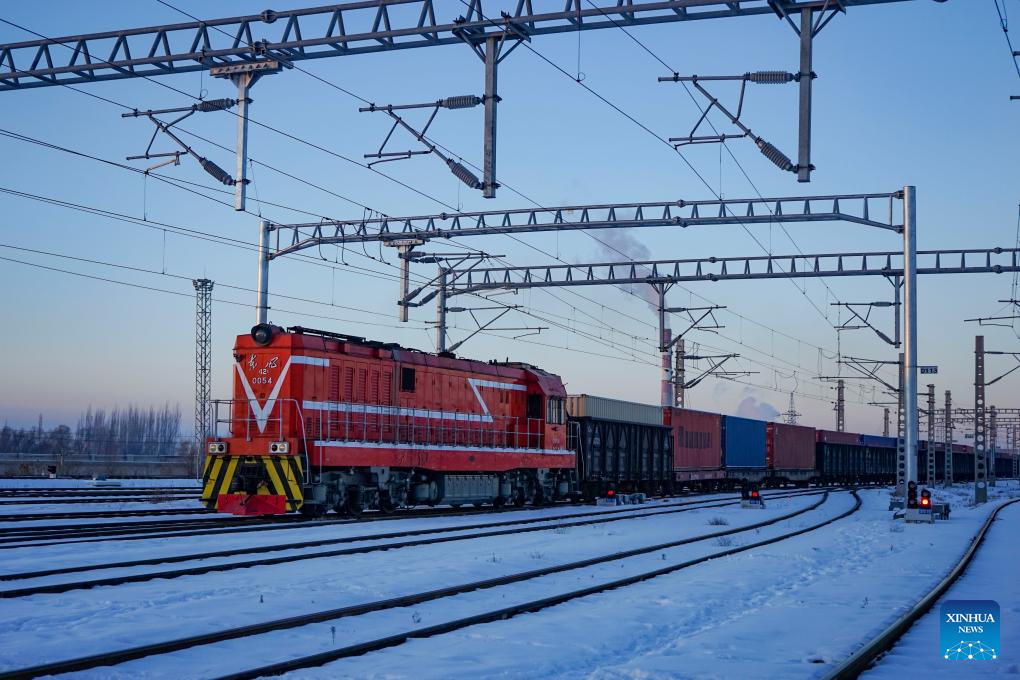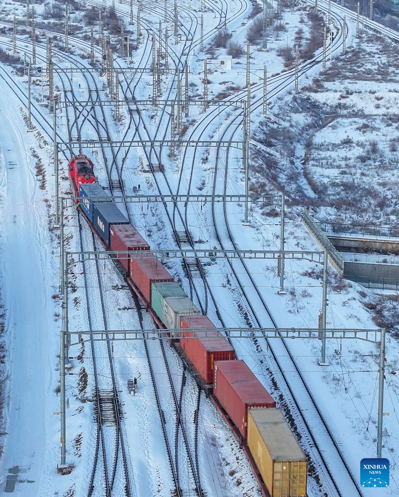 A China-Europe freight train bound for Kazakhstan passes through Horgos railway port in Horgos, northwest China's Xinjiang Uygur Autonomous Region, Dec. 25, 2024. Horgos Port, a major railway hub in Xinjiang, has facilitated 8,541 China-Europe freight train trips by Dec. 24 this year, according to statistics from the railway department of Horgos Port. (Xinhua/Jin Bowen)