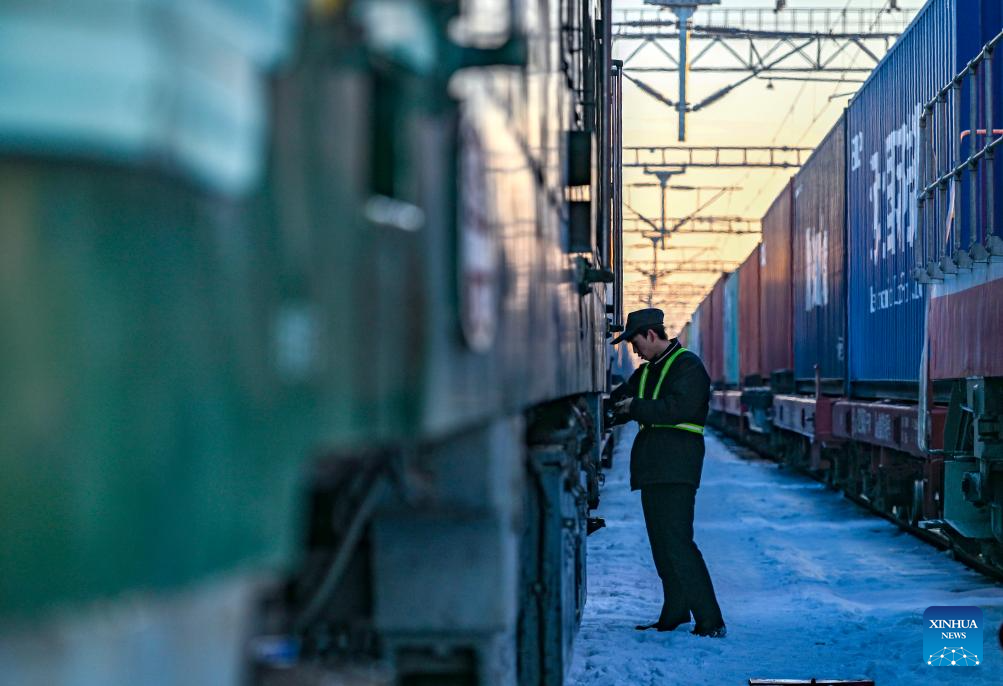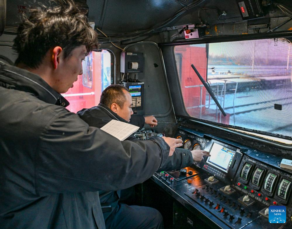 A driver of a China-Europe freight train checks hardware of the train before departure in Horgos, northwest China's Xinjiang Uygur Autonomous Region, Dec. 25, 2024. Horgos Port, a major railway hub in Xinjiang, has facilitated 8,541 China-Europe freight train trips by Dec. 24 this year, according to statistics from the railway department of Horgos Port. (Xinhua/Chen Shuo)