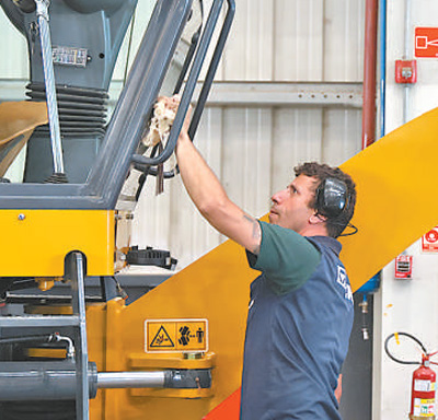 A staff member checks the equipment that just rolled off the production line at XCMG Group's manufacturing base in Pouso Alegre, Brazil. (People's Daily/Shi Guanghao)
