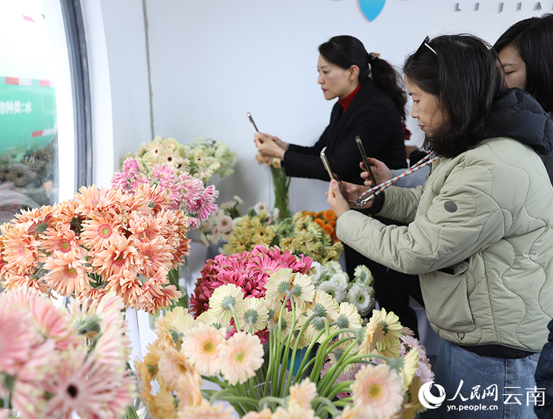 Tourists buy fresh-cut flowers at the Dounan Flower Market in Dounan, Kunming, southwest China's Yunnan Province. (People's Daily Online/Li Faxing)