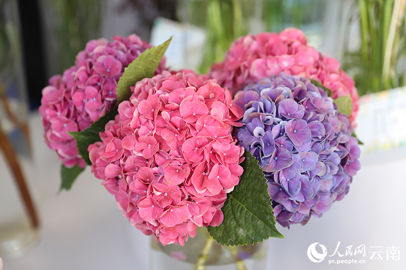 Photo shows a new variety of hydrangea flowers with independent intellectual property rights on display during the 2024 China Kunming Dounan Flower Exhibition in Dounan, Kunming, southwest China's Yunnan Province. (People's Daily Online/Li Faxing)