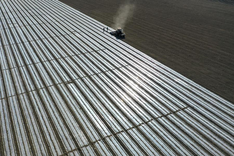 A drone photo shows a self-driving seeder working in the farmland in Awat County of Aksu, northwest China's Xinjiang Uygur Autonomous Region, March 27, 2024. (Xinhua/Ding Lei)