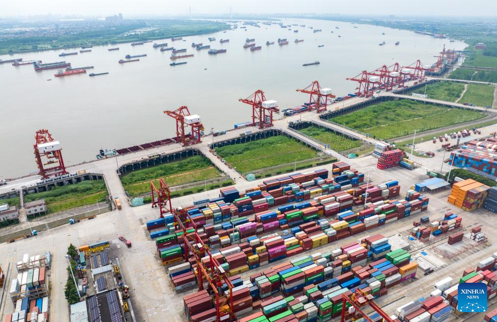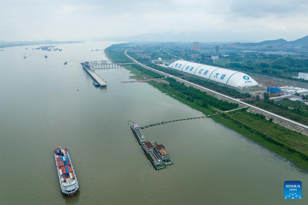 An aerial drone photo take on June 1, 2024 shows a view of the Yangluo Port in Wuhan, central China's Hubei Province. Major ports on the Yangtze, China's longest river, are expected to post a total throughput of 4.02 billion tonnes of cargo this year, breaking the mark of 4 billion tonnes for the first time, according to navigation authorities. (Xinhua/Du Zixuan)