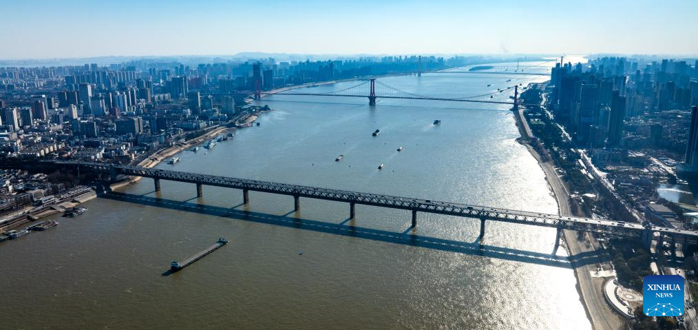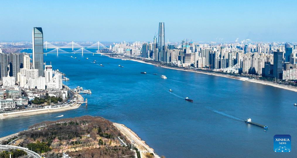 An aerial drone photo take on Jan. 23, 2024 shows ships sailing on the Yangtze River in Wuhan, central China's Hubei Province. Major ports on the Yangtze, China's longest river, are expected to post a total throughput of 4.02 billion tonnes of cargo this year, breaking the mark of 4 billion tonnes for the first time, according to navigation authorities. (Xinhua/Xiao Yijiu)