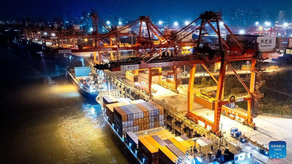 An aerial drone photo take on Dec. 20, 2024 shows a view of the Yangluo Port in Wuhan, central China's Hubei Province. Major ports on the Yangtze, China's longest river, are expected to post a total throughput of 4.02 billion tonnes of cargo this year, breaking the mark of 4 billion tonnes for the first time, according to navigation authorities. (Xinhua/Xiao Yijiu)