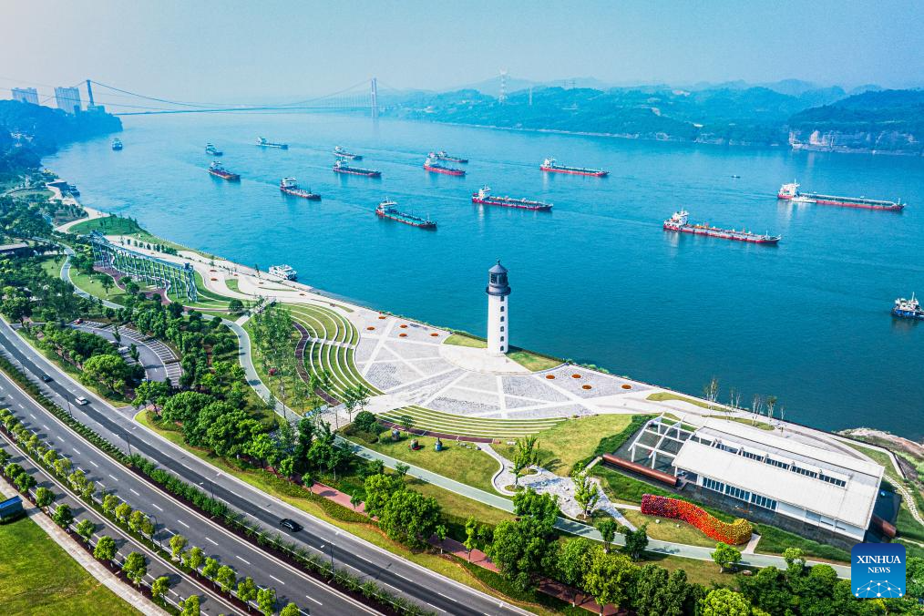 An aerial drone photo take on May 24, 2024 shows ships sailing on the Yangtze River in Yichang, central China's Hubei Province. Major ports on the Yangtze, China's longest river, are expected to post a total throughput of 4.02 billion tonnes of cargo this year, breaking the mark of 4 billion tonnes for the first time, according to navigation authorities. (Xinhua/Xiao Yijiu)