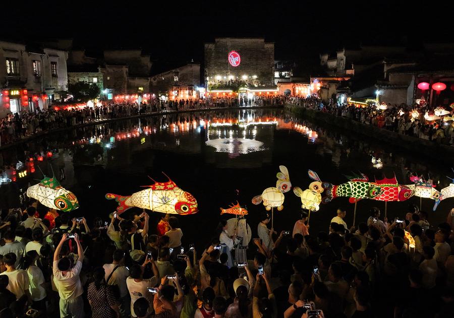 In this aerial drone photo, people holding festive lanterns parade at Hongcun Village of Yixian County, Huangshan City, east China's Anhui Province, Sept. 15, 2024. Yixian County is noted for its "lantern gala," an important folk event held during traditional festivals. (Photo by Shi Yalei/Xinhua)