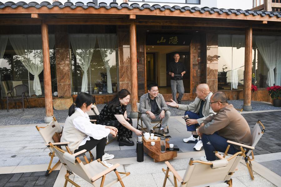 Tourists enjoy their time at a homestay in Jinyun Village of Beibei District of southwest China's Chongqing Municipality, Oct. 15, 2024. (Xinhua/Wang Quanchao)