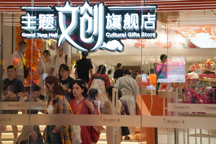 Tourists shop at a cultural gifts store of the Grand Tang Mall, a Tang Dynasty-themed pedestrian area, in Xi'an, northwest China's Shaanxi Province, May 20, 2024. (Xinhua/Shao Rui)