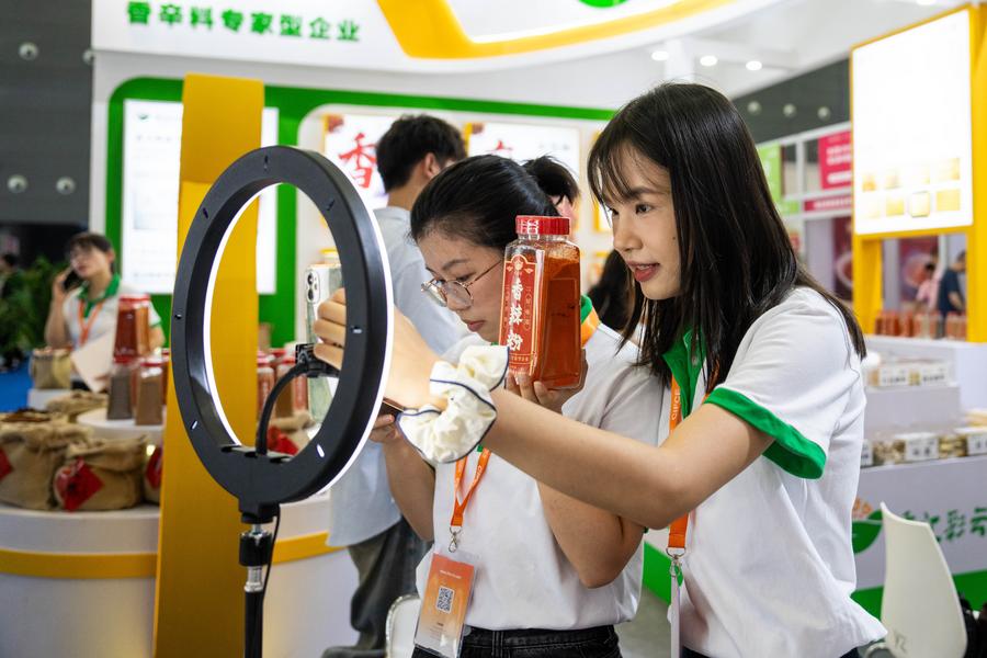 An exhibitor promotes spices through live-streaming during the 9th China International Food and Catering Expo in Changsha, central China's Hunan Province, Sept. 6, 2024. (Xinhua/Chen Sihan)