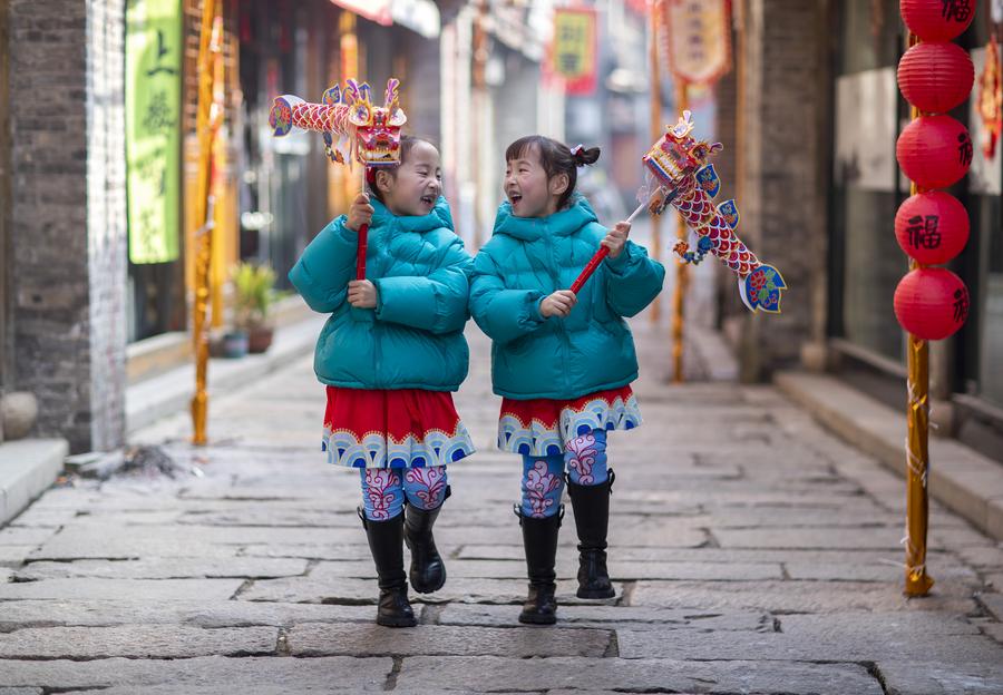 A pair of twins play at a cultural and tourism site in Xinghua City, east China's Jiangsu Province, Feb. 11, 2024. (Photo by Zhou Shegen/Xinhua)