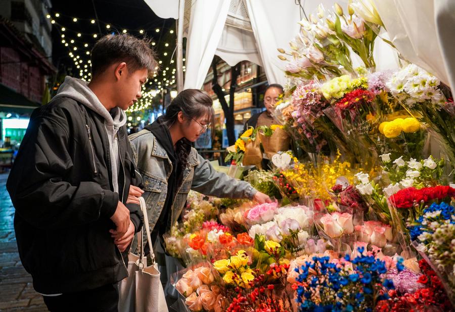 Tourists select flowers on a street at night in Kunming City, southwest China's Yunnan Province, Dec. 6, 2024. (Xinhua/Wang Jingyi)