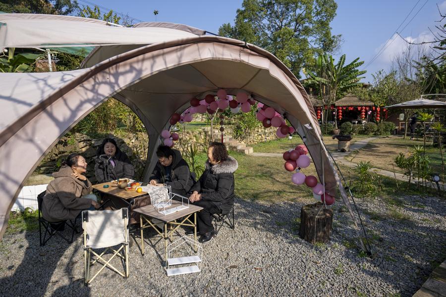 Tourists enjoy tea and snacks at a homestay in Tianfu Town of Beibei District, southwest China's Chongqing Municipality, Dec. 11, 2024. (Xinhua/Liu Chan)