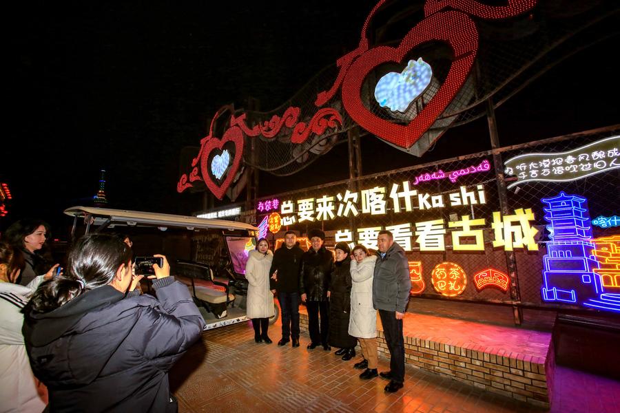 People pose for photos in the ancient city of Kashgar, northwest China's Xinjiang Uygur Autonomous Region, Feb. 4, 2024. (Photo by Cai Zengle/Xinhua)