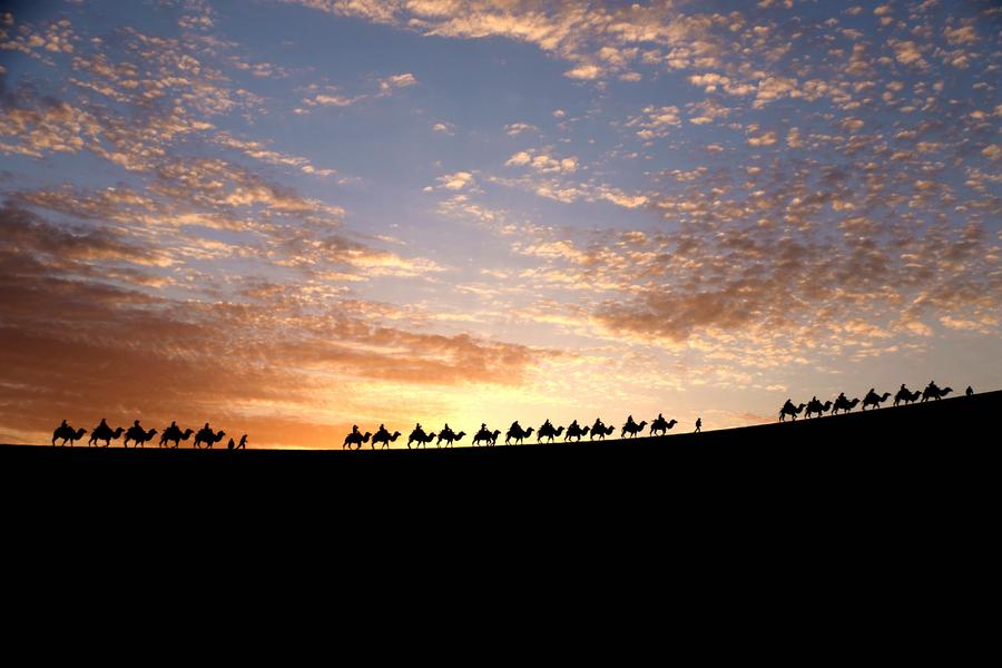 Tourists visit the Mingsha Mountain and Crescent Spring scenic spot in the city of Dunhuang, northwest China's Gansu Province, Oct. 4, 2024. (Photo by Zhang Xiaoliang/Xinhua)