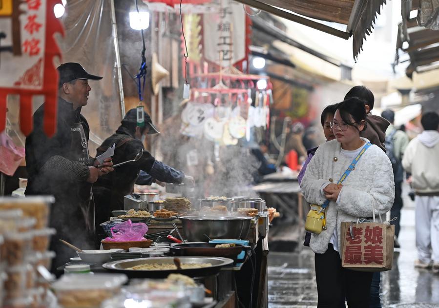 Tourists visit a morning tea street at the Youbu ancient town of Lanxi City, east China's Zhejiang Province, Dec. 5, 2024. (Xinhua/Lu Zhe)
