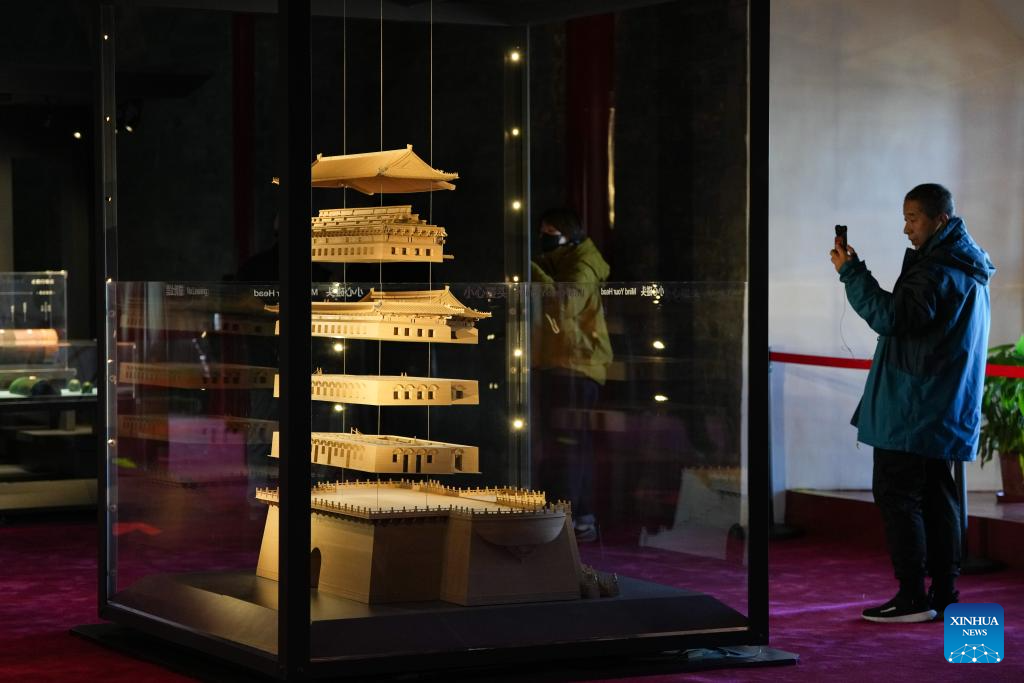 A man takes photos of a model of the Zhengyangmen Archery Tower inside Zhengyangmen Archery Tower in Beijing, capital of China, Dec. 26, 2024. (Xinhua/Ju Huanzong)