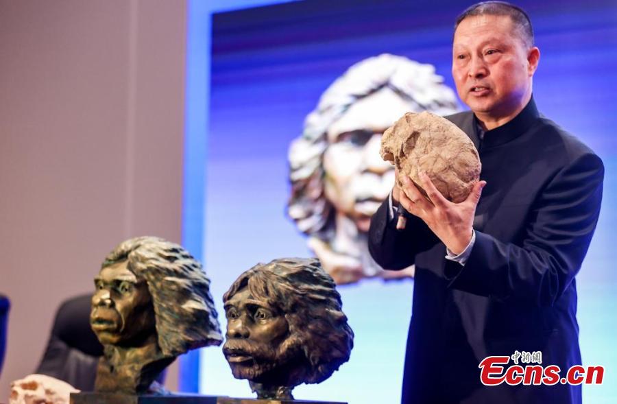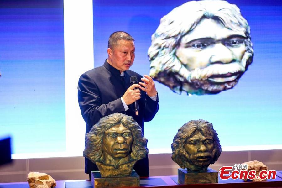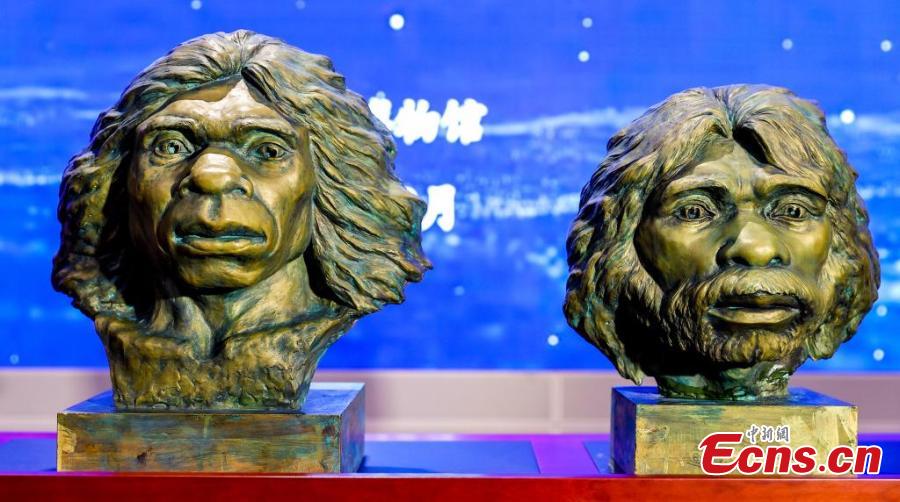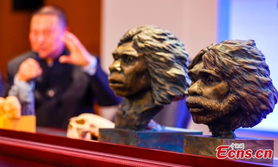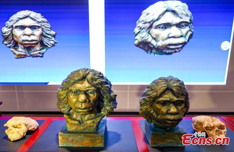 The restored statues of a pair of fossil human skulls of the "Yunxian Man", dating back to one million years ago, are unveiled by the Hubei Provincial Museum in Wuhan, central China's Hubei Province, Dec. 26, 2024. (China News Service/Zhang Yang)