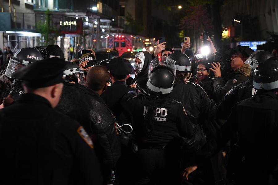 Protesters confront police officers near Columbia University in New York, the United States, on April 30, 2024. (Xinhua/Li Rui)
